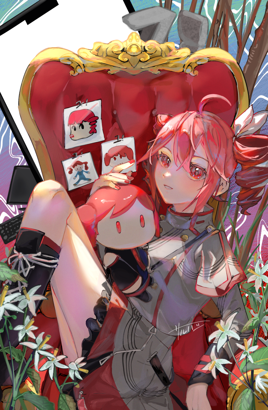 1girlahogeblack bootsblack skirtblue backgroundblushbootsbuttonscellphonedouble-breasteddouble-parted bangsdrawing (object)drill hairflowergrey jacketgrey skirtgrinhair between eyeshito mania (utau)honto no (utau)jacketknee bootskneehighslace-up bootslayered skirtlayered sleeveslong sleevesmini hen (utau)musical staffmusical staff printphonepurple backgroundred eyesred hairred skirtred socksred trimsitting on thronesitting sidewaysskirtsmartphonesmilesocksstriped clothesstriped jacketstriped skirtstuffed toythronetwin drillswhite flower