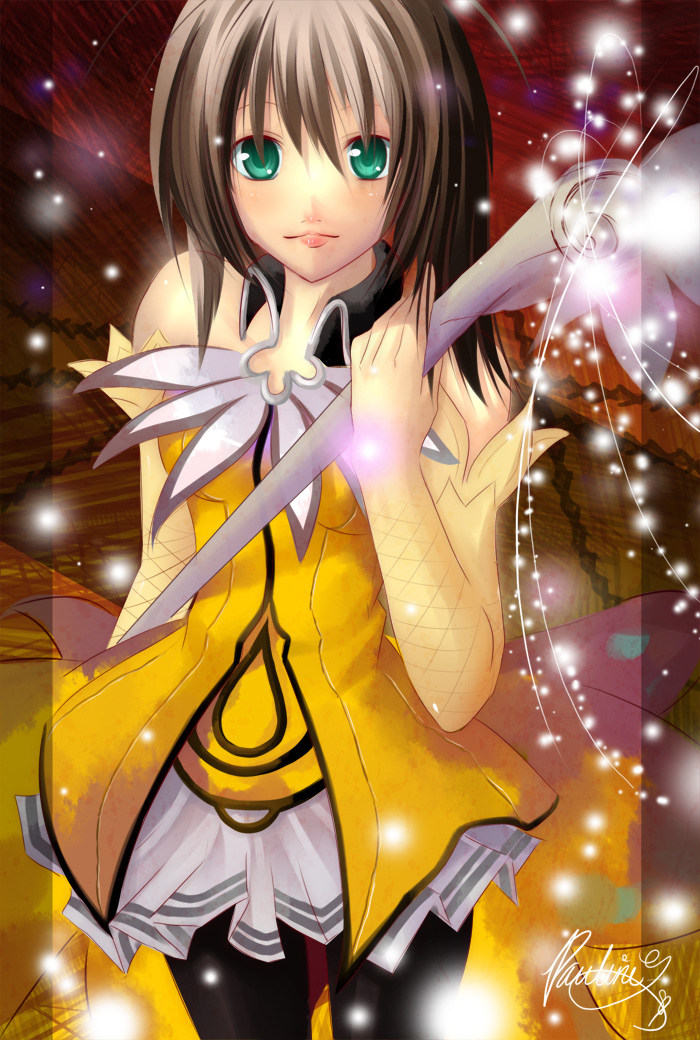 kouno (masao), bad id, bad pixiv id, translated, 1girl, body writing, brown hair, camisole, downblouse, female focus, long hair, solo, twintails, yellow eyes