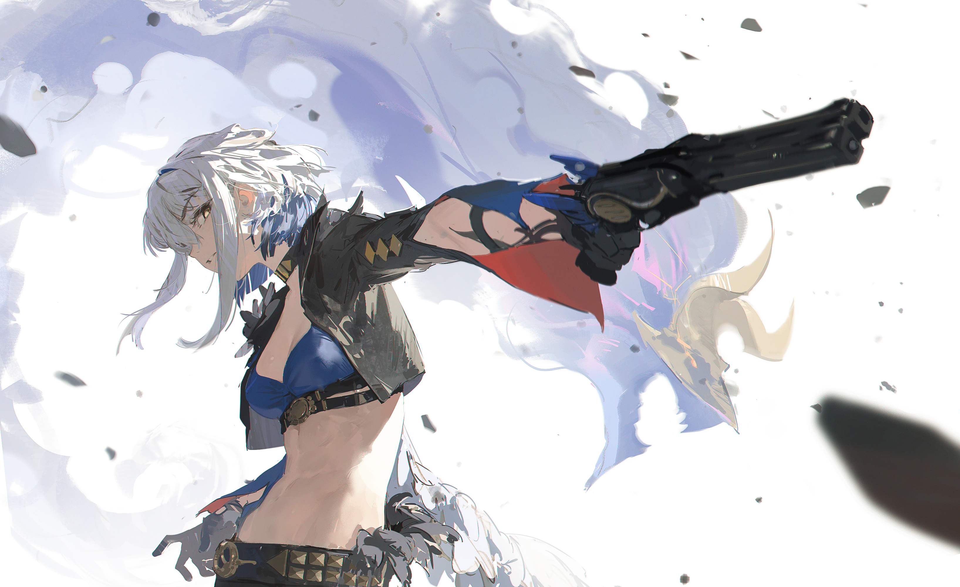 1girlaimingblack glovesblack jacketblue brabraglovesgrey hairgunholdingholding gunholding weaponjacketlooking at viewermedium hairnaveloutstretched armpurple eyessingle glovesolostomachtacet discord (wuthering waves)underwearupper bodyweapon