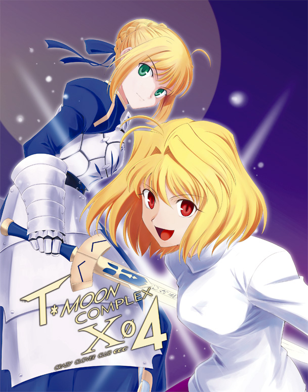 00s2girlsblonde hairexcalibur (fate/stay night)green eyesmultiple girlspurple skirtred eyesskirtsweaterswordweapon