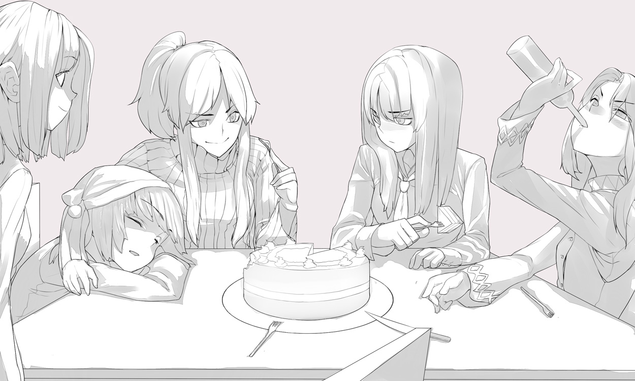 kutabireta neko, akari (pokemon), irida (pokemon), rowlet, nintendo, pokemon, pokemon legends: arceus, pokemon masters ex, commentary request, highres, textless version, 2girls, armpits, bare tree, black hair, blonde hair, blue eyes, closed mouth, eyelashes, gen 7 pokemon, grey eyes, hair between eyes, headscarf, jacket, long hair, multiple girls, multiple views, nipples, official alternate costume, pokemon (creature), red scarf, scarf, sidelocks, smile, speech bubble, thought bubble, tree