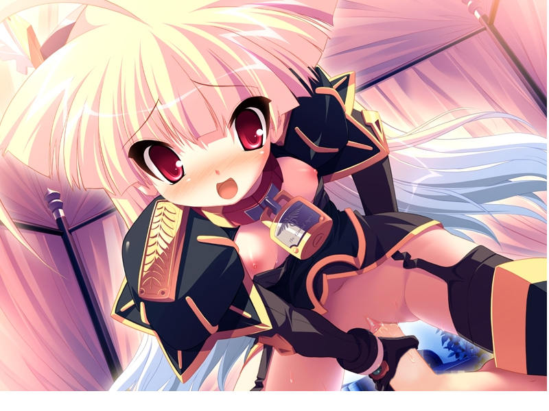 armorbedblushbreastscensoredcollarflat chestgirl on topglovesmulticolored hairopen mouthpenispussyred eyessexstraddlingthighhighs