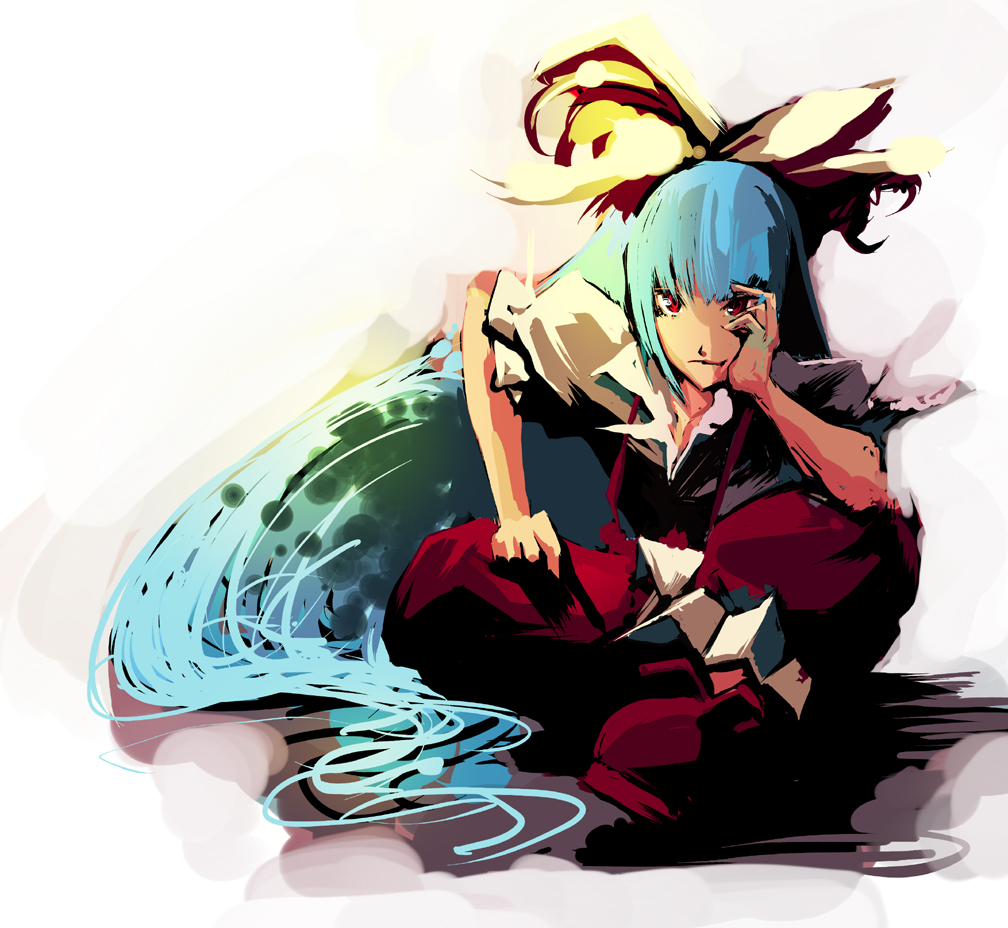 nanao naru, shihou matsuri, sola, 00s, 1girl, beret, bow, bowtie, cowboy shot, female focus, hat, long hair, long sleeves, looking at viewer, outstretched arms, pleated skirt, purple eyes, purple hair, purple skirt, purple thighhighs, red bow, red bowtie, running, skirt, solo, thighhighs, very long hair, zettai ryouiki