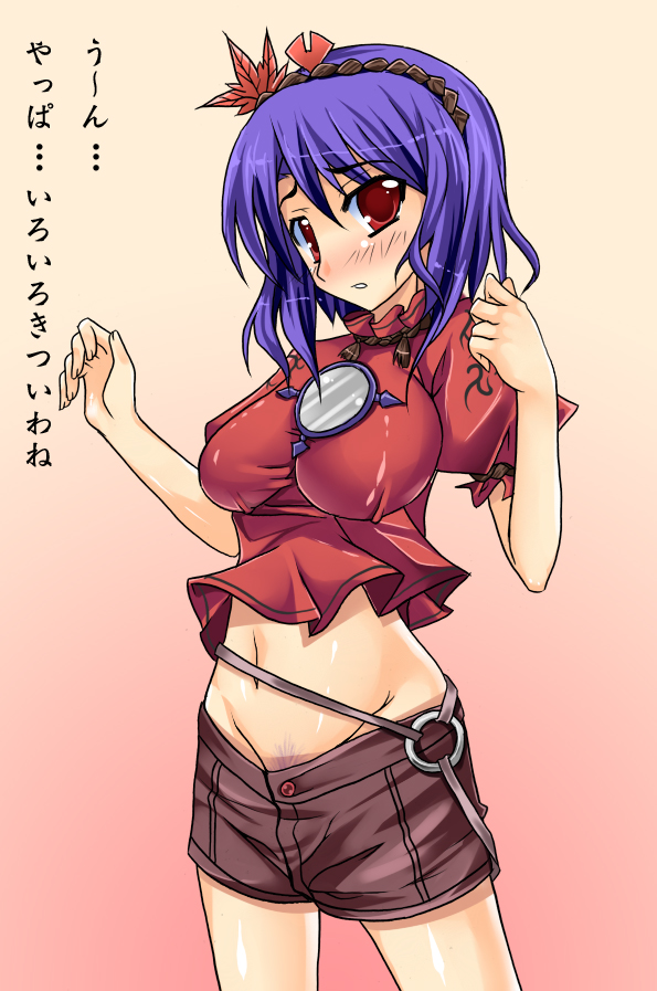 1girlbreastscolored pubic hairfemale focusfemale pubic hairhair ornamentimpossible clothesimpossible shirtlarge breastsleafleaf hair ornamentmidriffno pantiespubic hairpurple hairred eyesshirtshortssolowardrobe malfunction