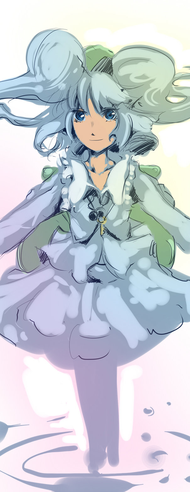 1girlbackpackbagblue eyesblue hairfemale focusgradient backgroundhatkeymatching hair/eyesrandoseruskirtsolotwo side upwhite background