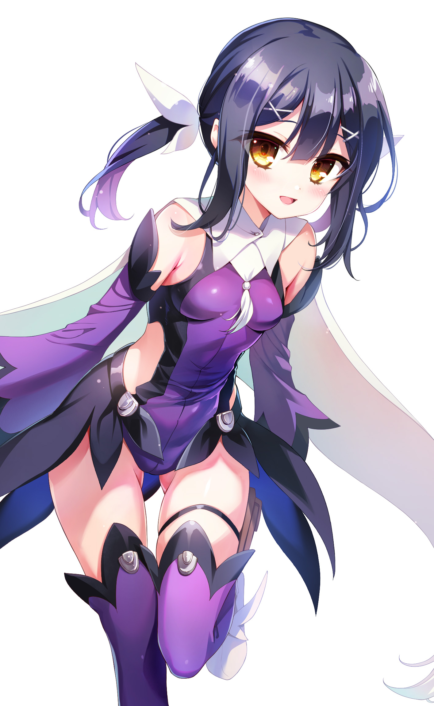 1girlbare shouldersblack hairblushbootsbreastsbrown eyescapedetached sleevesfeather hair ornamentfeathershair ornamenthairclipleotardlong hairlooking at vieweropen mouthpurple leotardpurple sleevespurple thighhighssidelockssmall breastssmilesolothighhighsthighhighs under bootsthighstwintailswhite bootswhite cape