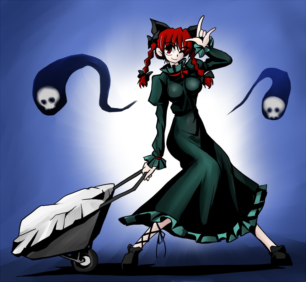 1girlanimal earsbraidbreastscat earscat girldressfemale focusfrillsfull bodygradient backgroundm/one eye closedred hairskullsolotwin braidswheelbarrowwhite backgroundwink