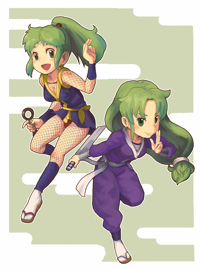 1girlalternate costumebreastscleavagefishnetsgreen eyesgreen hairjapanese clotheskunailong hairninjaponytailsmall breastsswordweapon