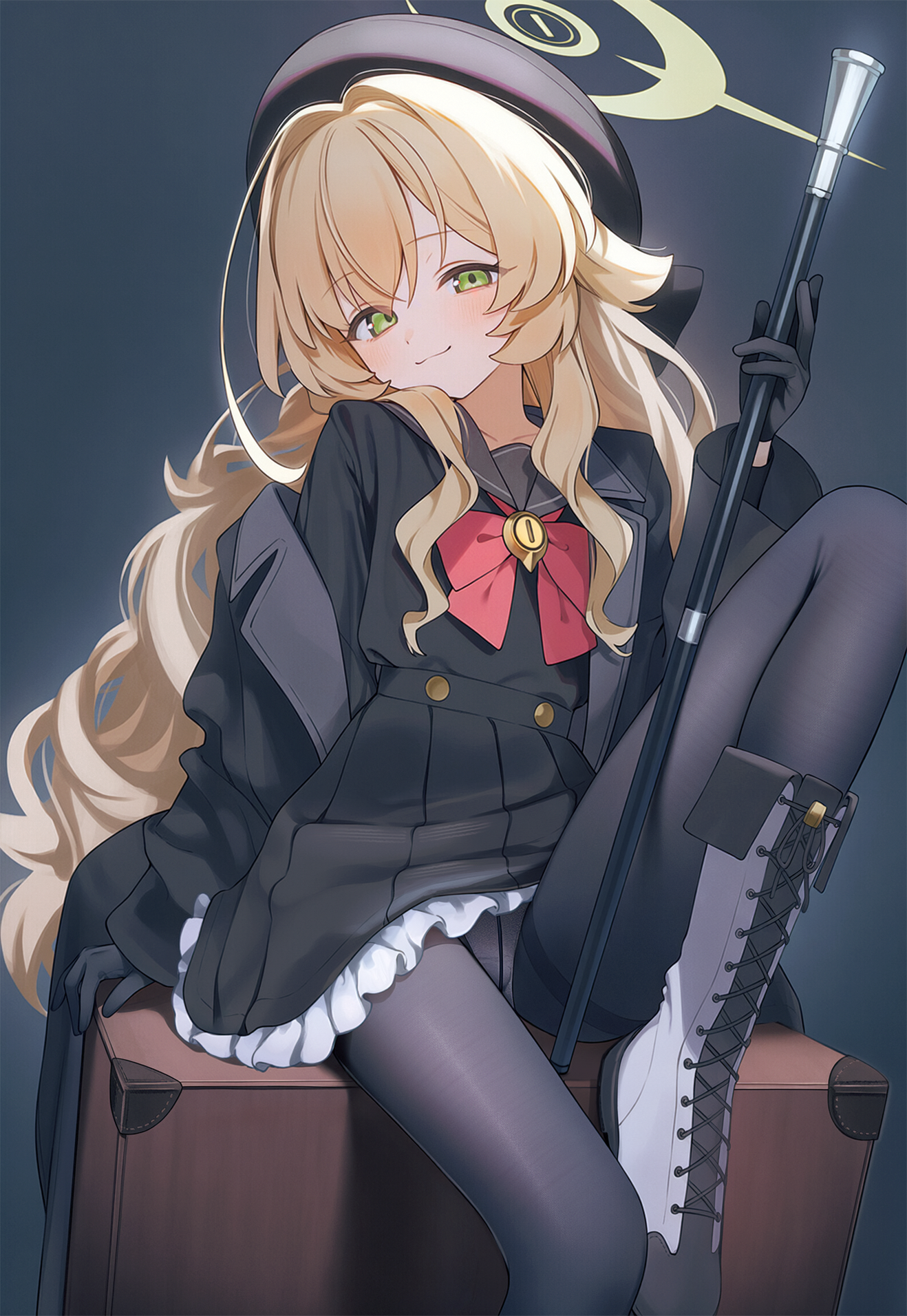 1girlblack glovesblack pantyhoseblonde hairbootsglovesgreen eyesgunhalohatlong hairpantyhosesoloweaponyellow halo