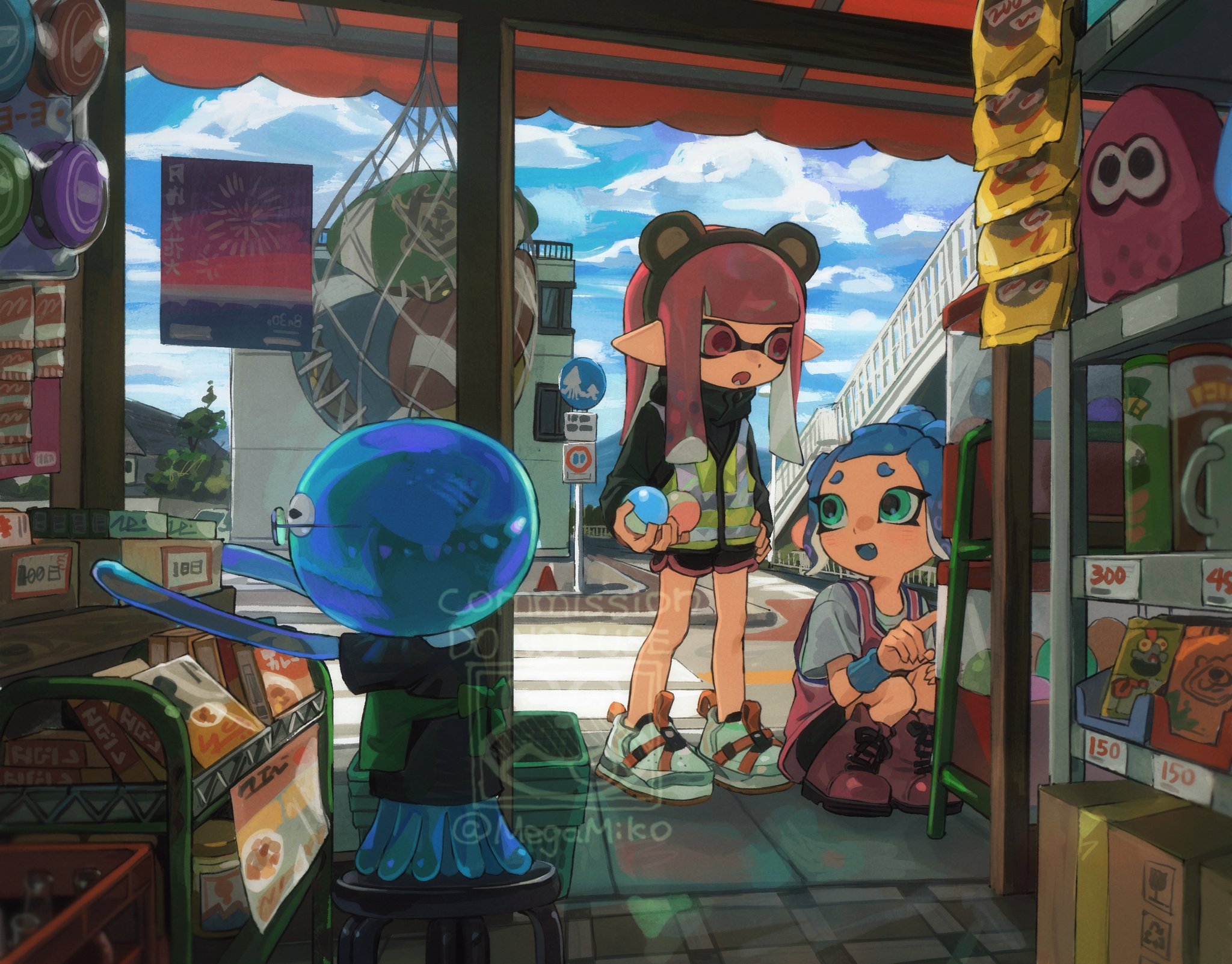 2girlsanimal ear hairbandanimal earsbear earsblack jacketblack shortsblue eyesblue hairblue tonguebootsbrown hairbandcolored tonguedolphin shortsfake animal earsfangfull bodyhairbandhand on own hiphigh-visibility clothinghigh-visibility vestinklingjacketjerseylace-up bootslong hairlooking at anothermultiple girlsoctolingopen mouthparted bangspink bootspink eyespink hairpointy earsshirtshoesshopshort hairshortssquattingstandingt-shirttentacle hairwatermarkwhite shirtwhite shoeswristband