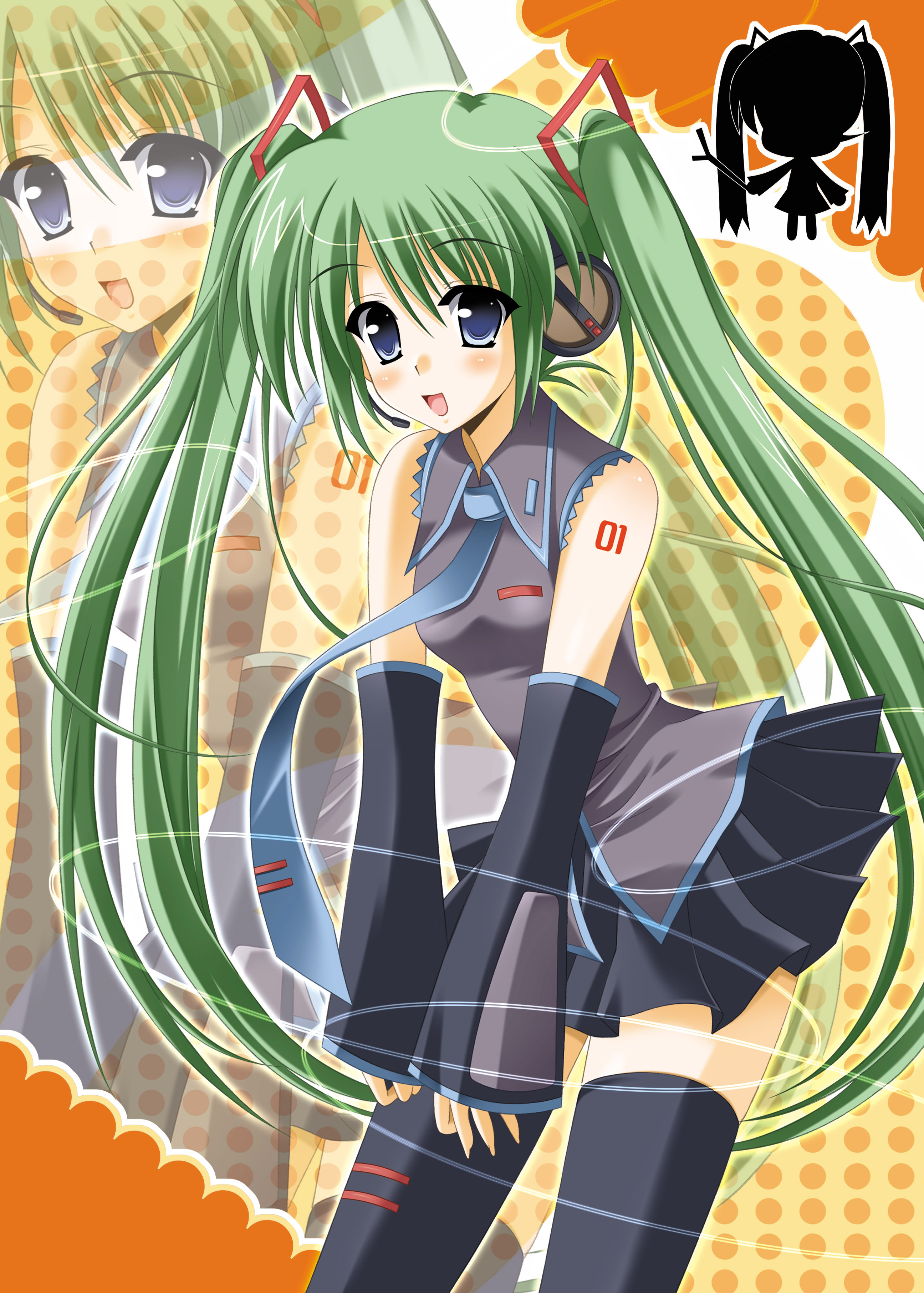 blue eyesdetached sleevesgreen hairheadsetlong hairnecktieskirtsolothighhighstwintailsvery long hair