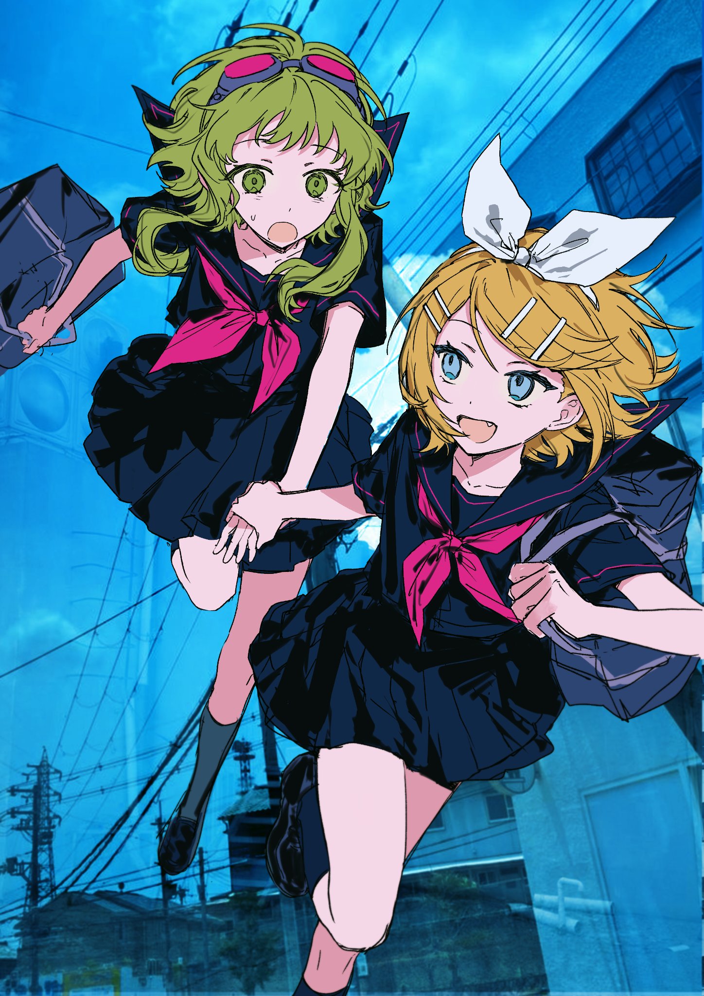 2girlsbagblack serafukublack shoesblack socksblonde hairblue eyesbowfanggogglesgoggles on headgreen eyesgreen hairhair bowhair ornamenthairclipholdingholding bagholding handskneehighsloaferslooking at anothermultiple girlsneckerchiefopen mouthphoto backgroundpink neckerchiefpleated skirtred-tinted eyewearrunningschool uniformserafukushirtshoesshort hairskirtsmilesockssweatdroptinted eyewearwhite bow