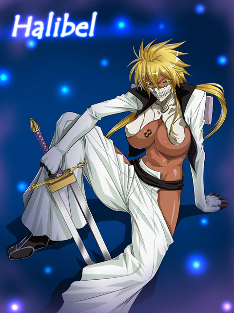 00s1girlabsarm supportarrancarblonde hairbreastscleavagecovered erect nipplescrop topdark skindark-skinned femalefemale focusgreen eyeshollow (bleach)large breastslong hairmaskmidriffno brano pantiesnumber tattoorevealing clothessittingsolospiked hairswordtattooteethtwintailsunderboobweapon