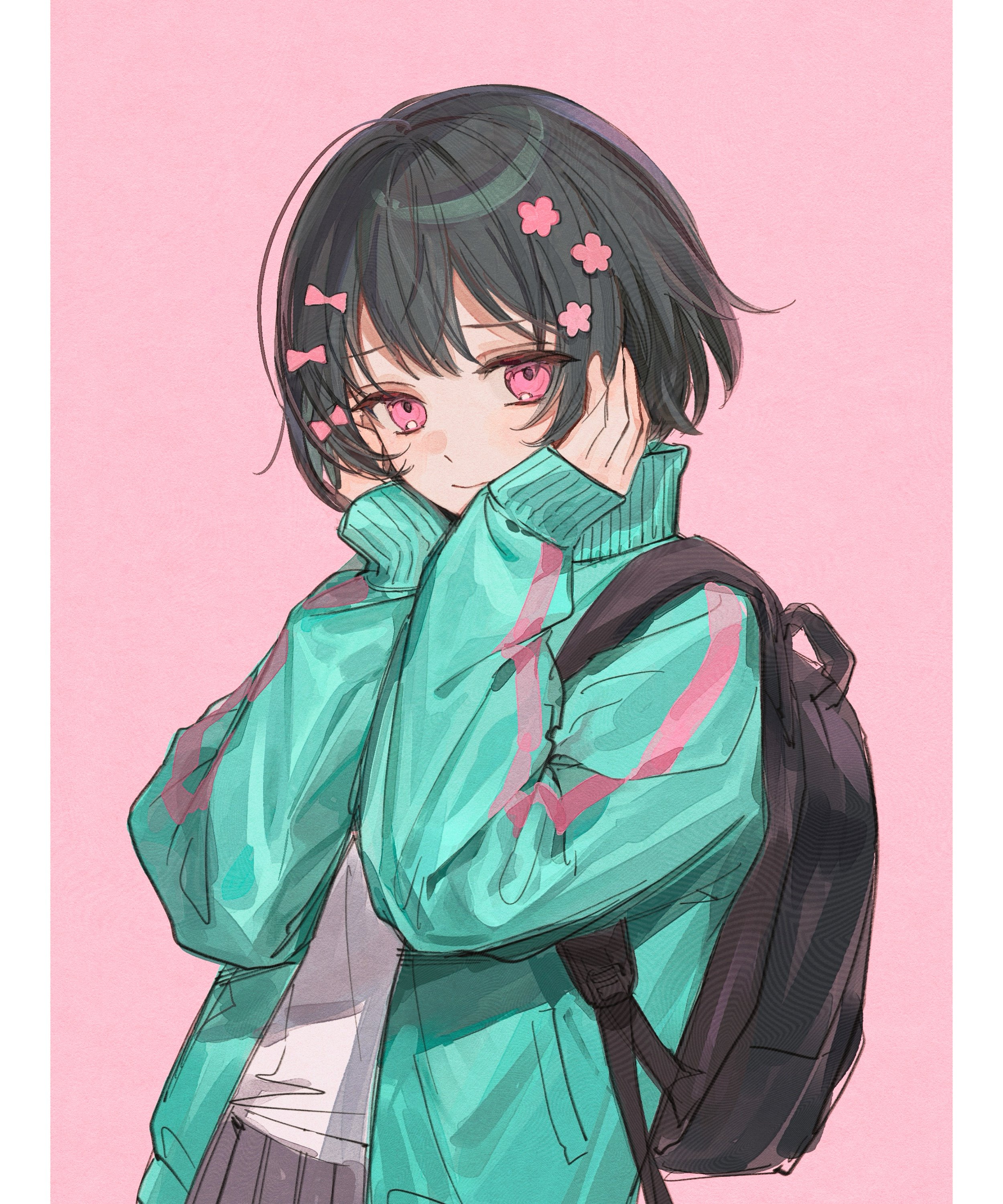 1girlaqua jacketbackpackbagblack hairbowclosed mouthflowerhair bowhair flowerhair ornamenthands on own cheekshands on own facejacketlong sleeveslooking at vieweropen clothesopen jacketpink backgroundpink bowpink eyespink flowerpink trimshirtshort hairsimple backgroundsolotrack jacketwhite shirt