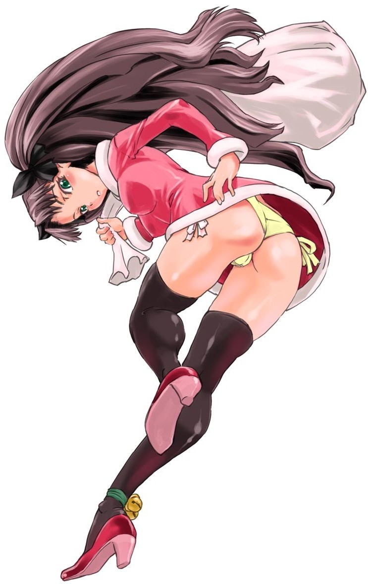 00s1girlassbellblack hairblack thighhighscameltoechristmasfemale focusfrom belowgreen eyeslong hairpantiessanta costumeside-tie pantiessolothighhighsthighsunderwearyellow panties
