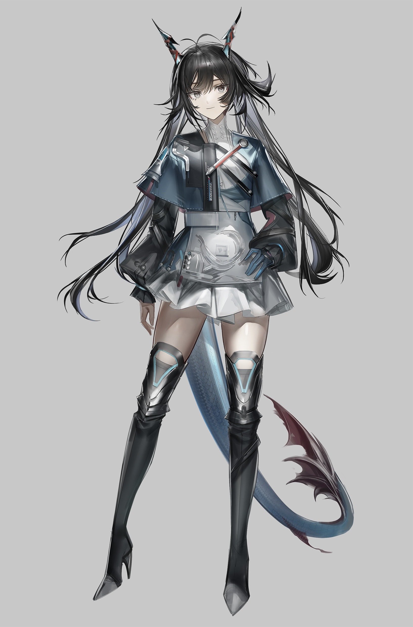 kio26g, firefly (honkai: star rail), honkai: star rail, honkai (series), highres, 1girl, ?, blue eyes, brown hair, brown jacket, collared shirt, english text, green pupils, grey hair, hair between eyes, hair intakes, hair ornament, jacket, long hair, multicolored eyes, neckerchief, orange neckerchief, own hands together, shirt, simple background, solo, twitter username, white background, white shirt