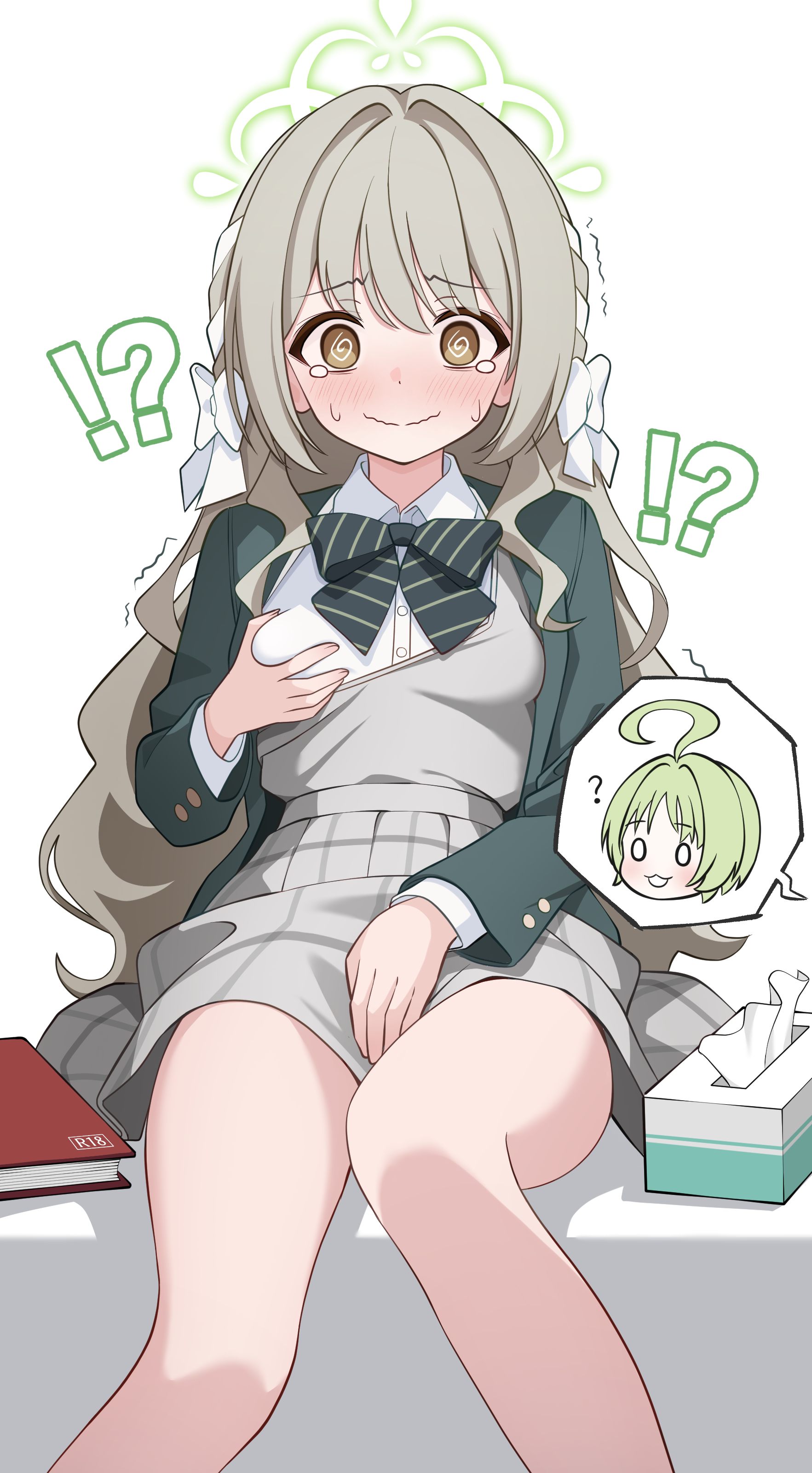 fukutchi, kouhai-chan (fukutchi), original, absurdres, commentary request, highres, translation request, 1girl, :o, black sweater, bob cut, brown hair, casual, closed eyes, hand on own hip, kneehighs, kneeling, light blush, loafers, long sleeves, loose socks, low block heels, medium hair, multiple views, open mouth, outstretched arms, pleated skirt, purple eyes, scrunchie, shoes, simple background, sitting, sketch, skirt, smile, socks, sweater, white socks, wrist scrunchie