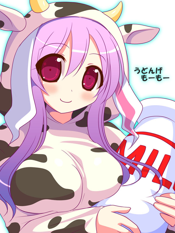 1girlanimal earsbreastscostumecowfemale focuslarge breastslong hairmilkpurple hairrabbit earsred eyessolo