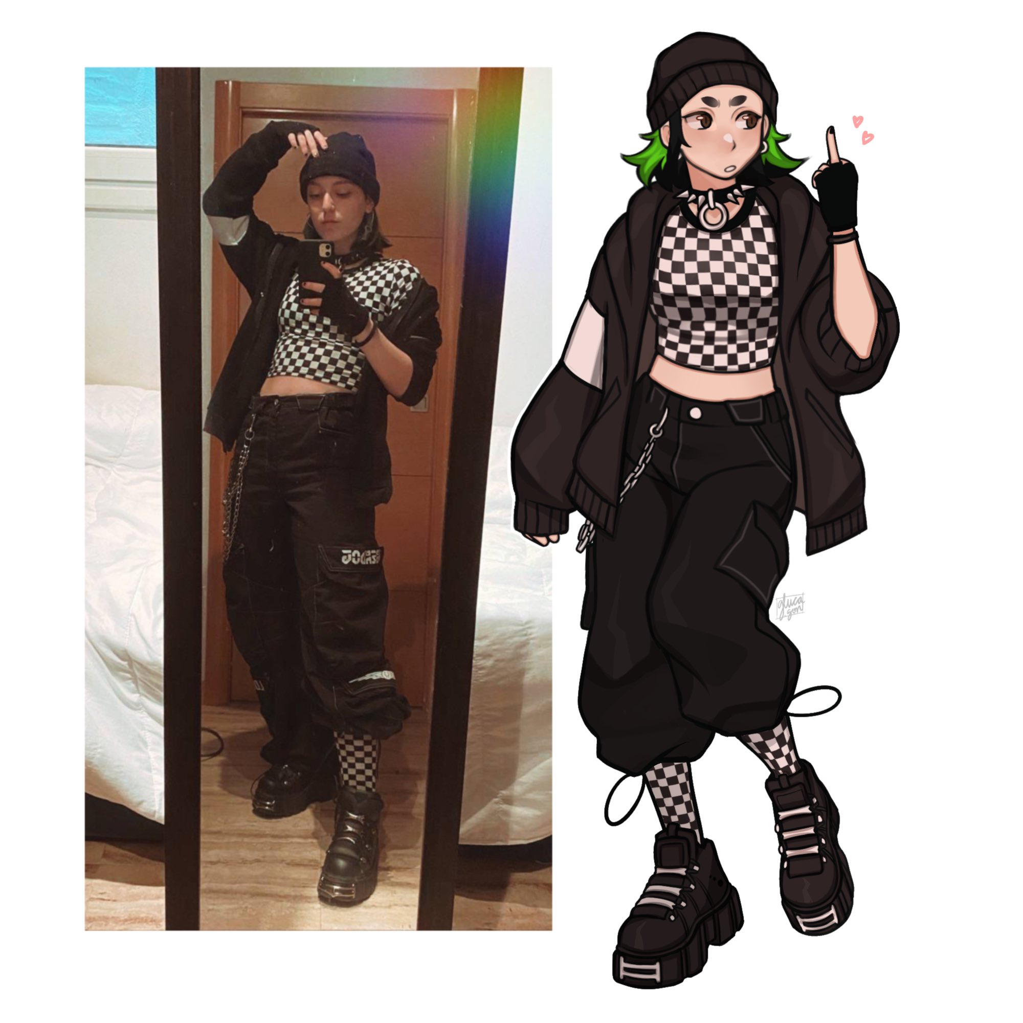 1girlart vs artistbeanieblack glovesblack hairblack hatblack hoodieblack pantsblack shoesbrown eyescargo pantschaincheckered clothescheckered shirtcheckered sockscollarearringsfingerless glovesglovesgreen hairhathoodhoodiejewelrymiddle fingermidriffmulticolored hairopen clothesopen hoodiepantsphoto insetself-portraitshirtshoesshort eyebrowssignaturesolospiked collarspikestwo-tone hair