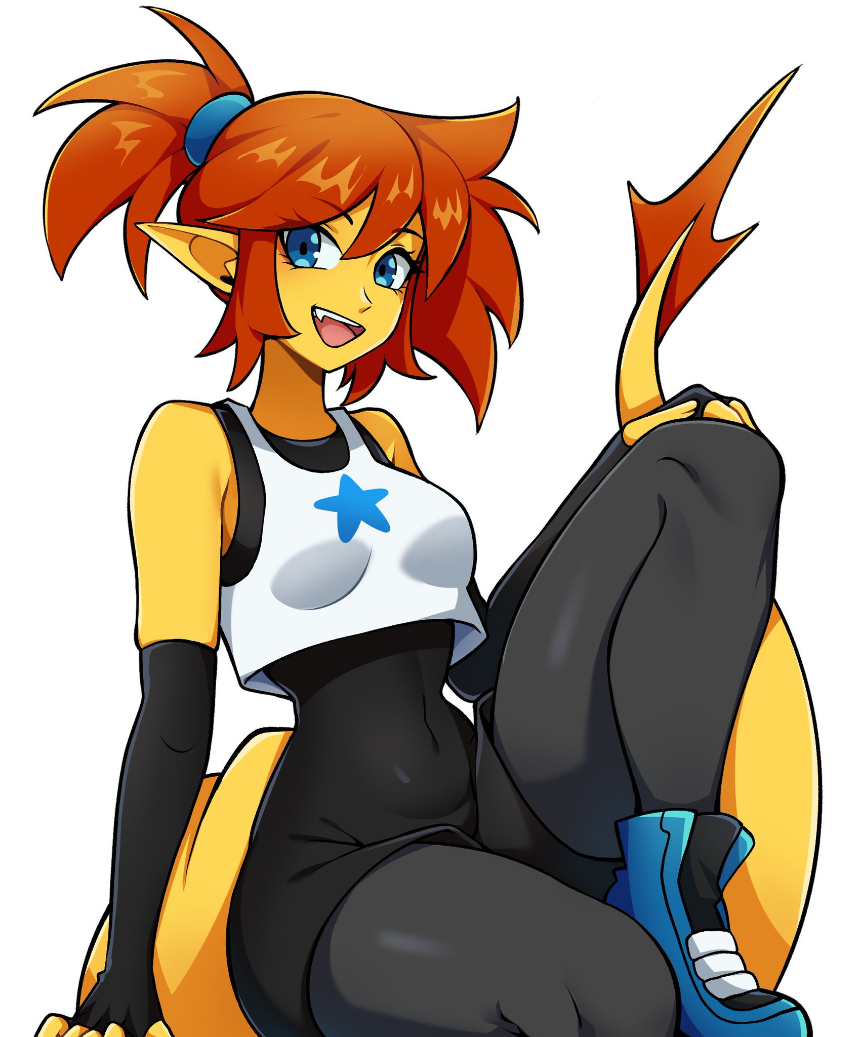 1girlbare shouldersblack bodysuitblack glovesblack pantyhoseblue eyesblue shoesbodysuitborrowed characterbreastscolored skincrop topdouble-parted bangselbow glovesfangfingerless glovesgloveshand on own kneeknee uplooking at viewermedium breastsopen mouthorange hairpantyhosepointy earsshoesshort hairsimple backgroundsittingsmilesolostar (symbol)star printsunny (qtip xd)tailwhite backgroundyellow skin