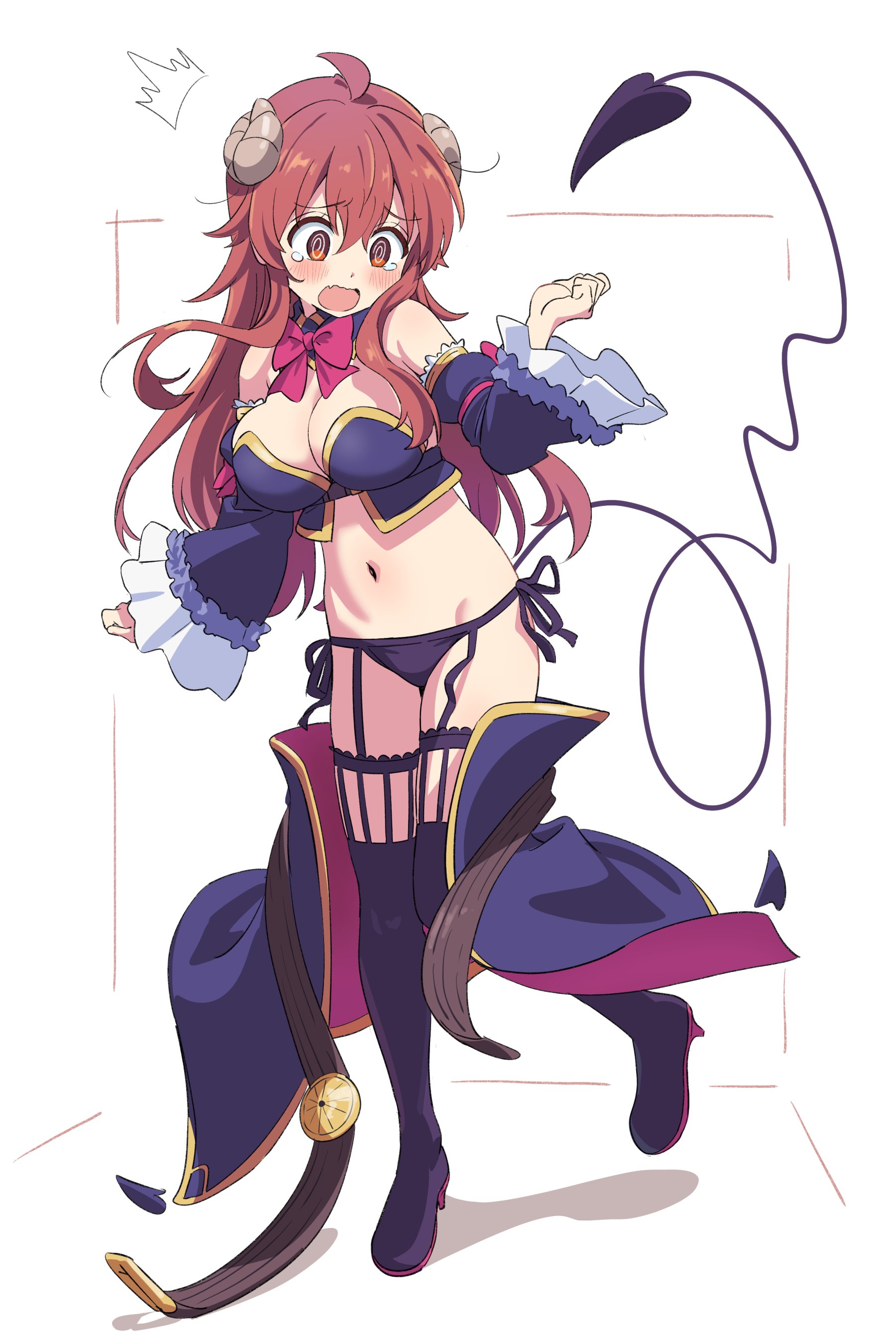 1boy1girlblushbreastscleavagecrisis management form (machikado mazoku)curled hornsdemon girldemon hornsdemon taildetached sleevesfull bodyhornslarge breastslong hairnavelopen mouthpantiespurple pantiespurple sleevespurple thighhighsred eyesred hairsolostandingstanding on one legstomachtailtearsthighhighsunderwearwardrobe malfunction