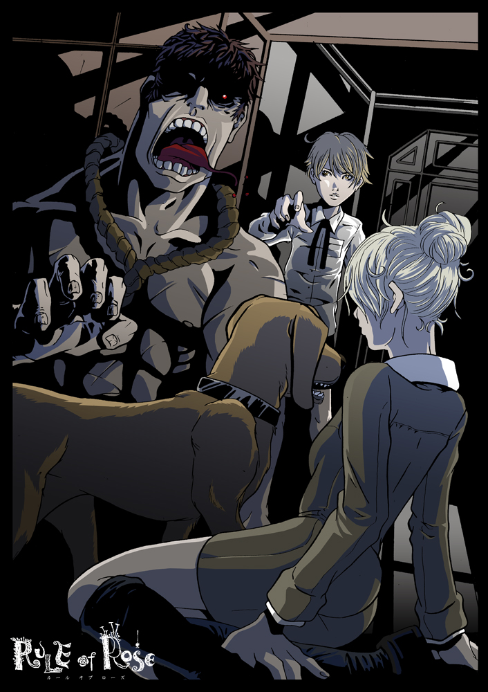 1girl2boysangryblonde hairbloodcollarcopyright namecrossdressingdogdressgregory m wilsonhair bunkneehighsmale focusmonstermultiple boysnooseopen mouthred eyesropesittingsocksteethtonguewig