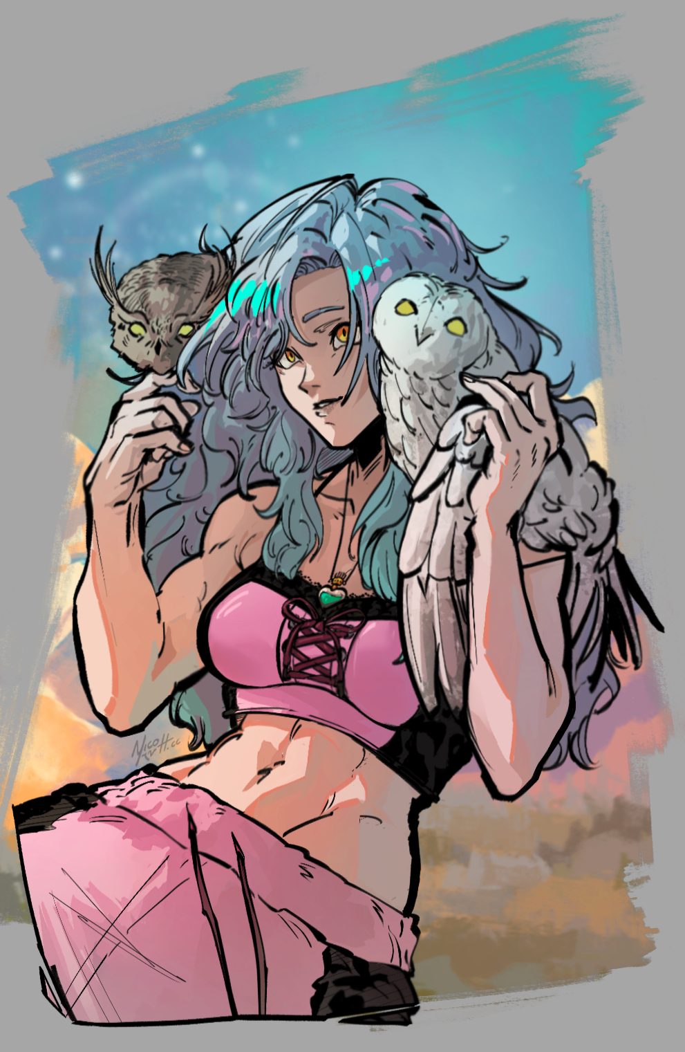 absbirdgrey hairjewelrylocketmidriffowlowlthypajamaspantspendantpink pajamaspink pantssimple backgroundvirtual youtuberyellow eyes