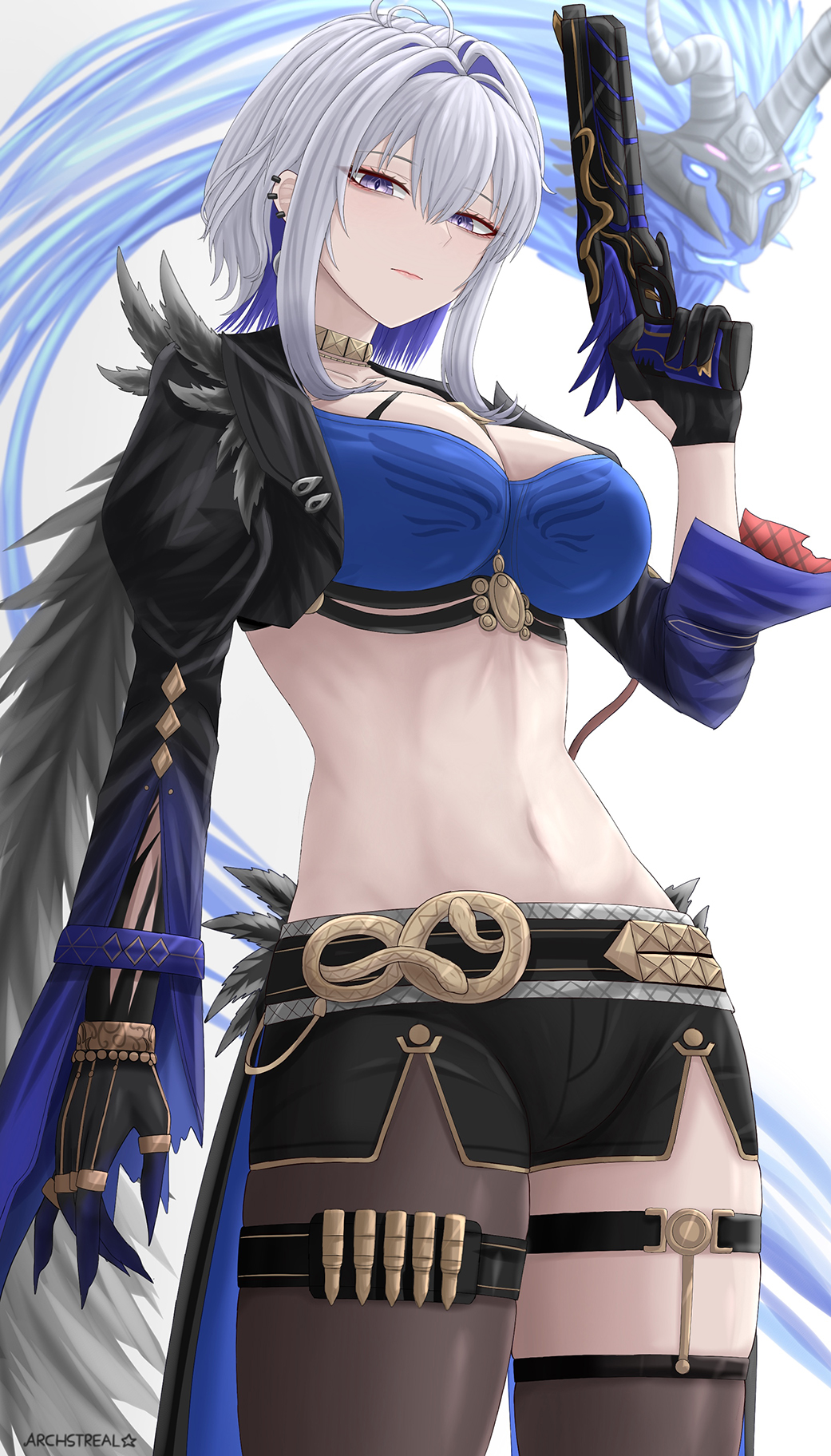 1girlartist nameblack glovesblack jacketblack shortsblue brablue hairbrabreastscolored inner haircowboy shotcropped jacketglovesgold chokergrey hairgunhair between eyeshand upholdingholding gunholding weaponjacketlarge breastslooking at viewermedium hairmulticolored hairnavelpurple eyesshortssidelockssingle leg pantyhosesolostomachunderwearweapon