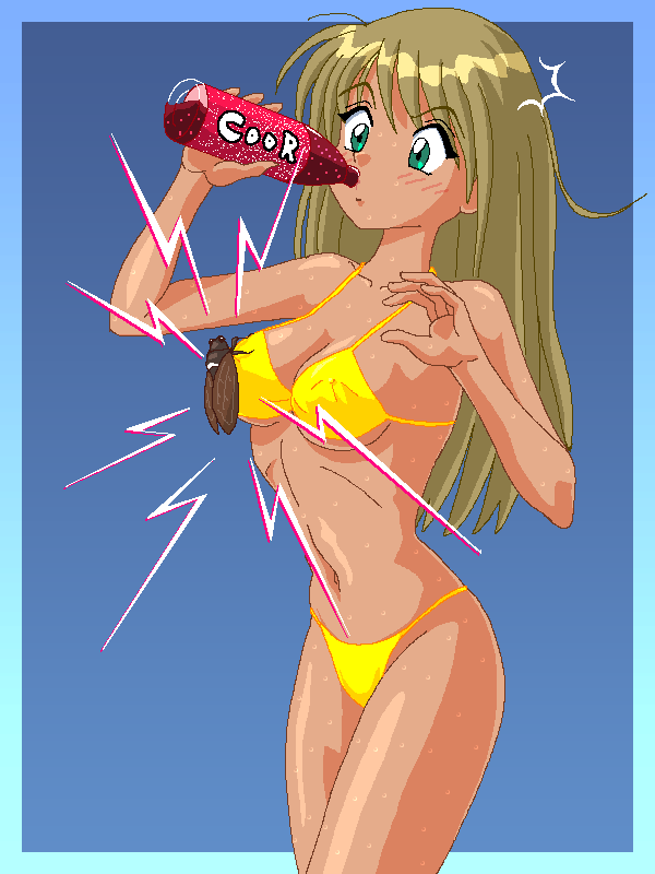 bikiniblonde hairbugcicadadark skindark-skinned femaledrinkinggreen eyesinsectlong hairsolosweatswimsuityellow bikini