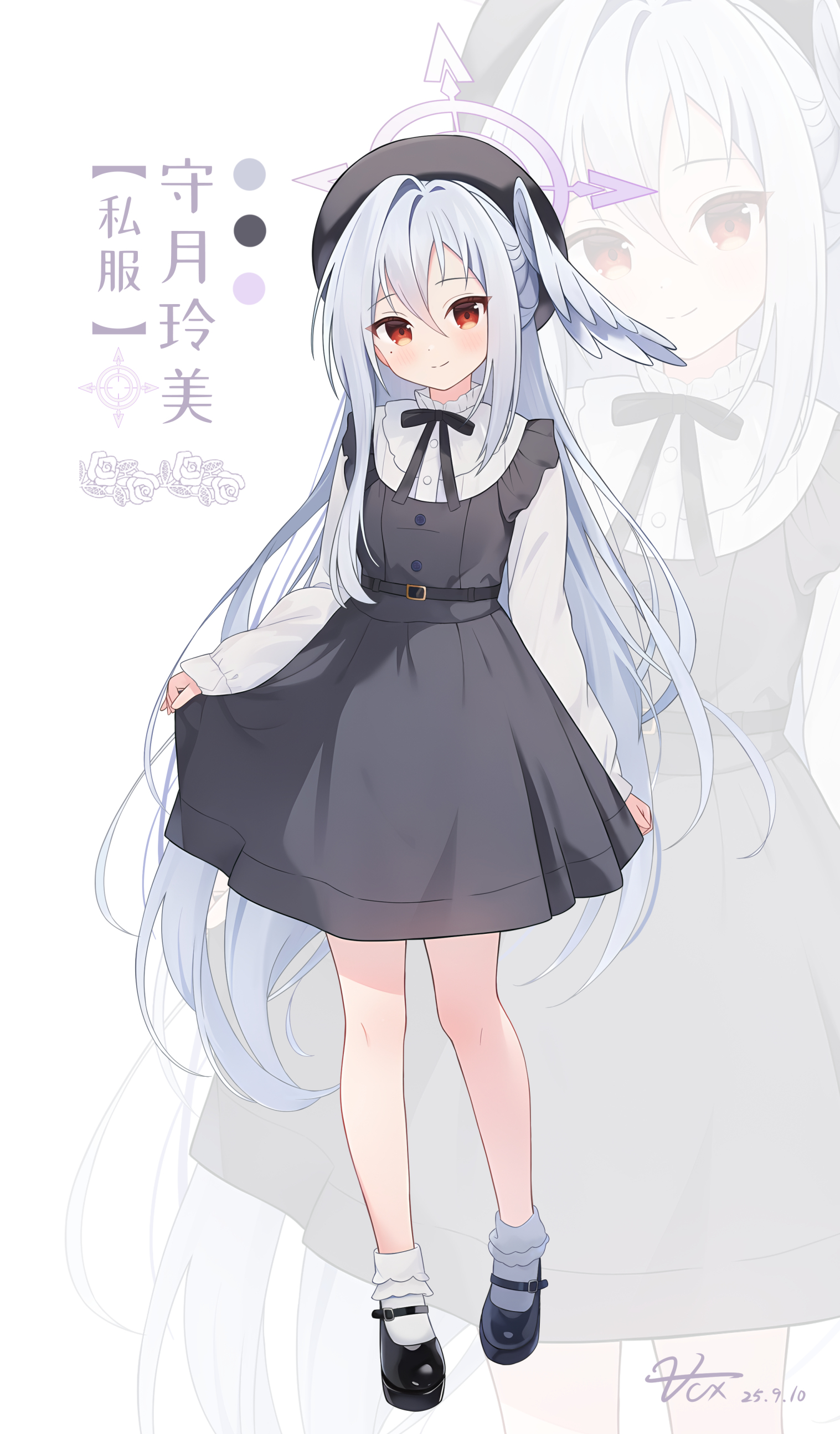 1girlalternate costumecasualdressfull bodyhalolong hairpurple halored eyessockssolowhite socks