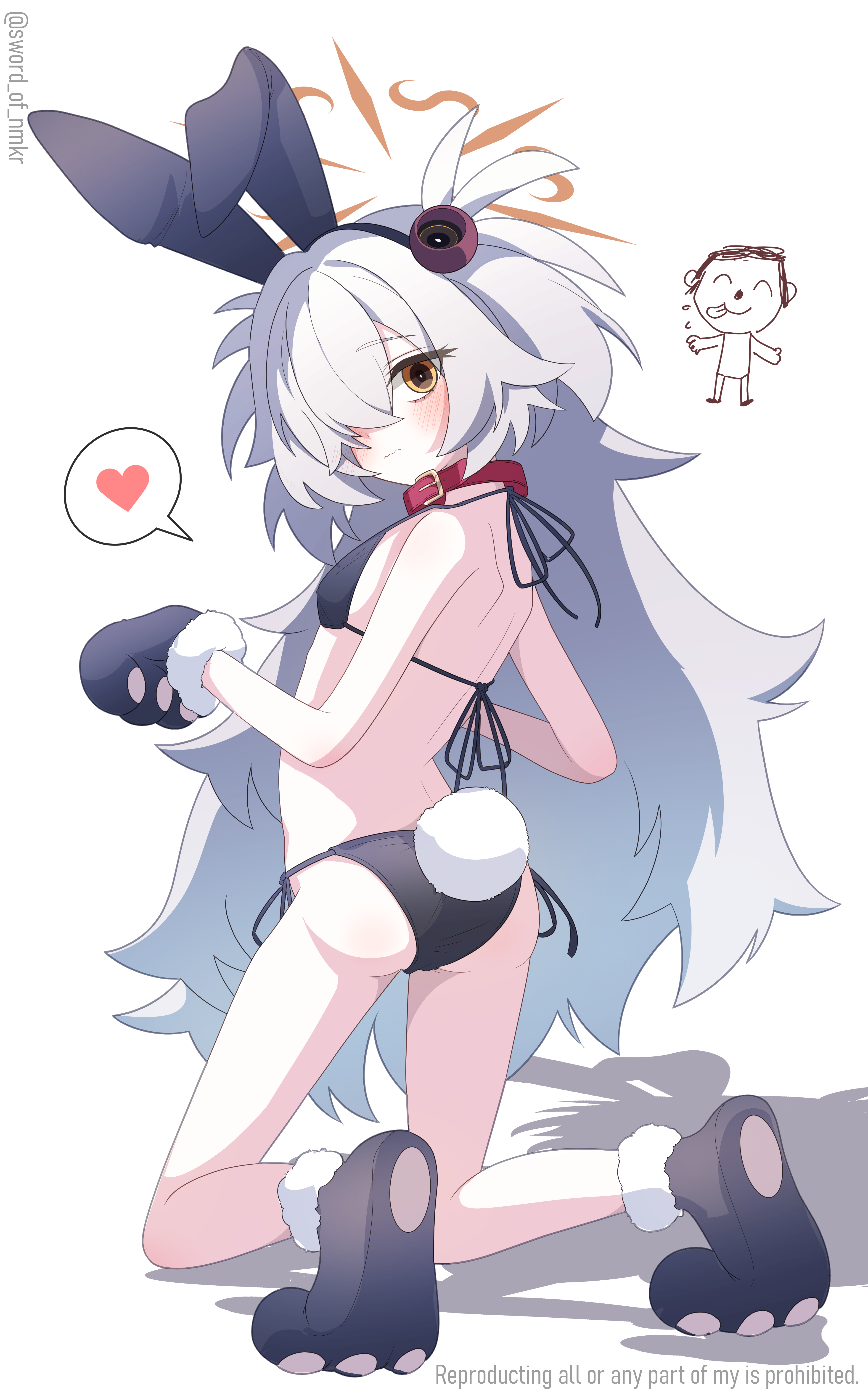 1boy1girlanimal earsanimal handsassbikiniblack bikiniblack glovesblack shoesblushbreastsclosed mouthcollarfake animal earsfake tailgloveshaloheartlong hairorange eyesorange halopaw glovespaw shoesrabbit earsrabbit tailred collarshoesside-tie bikini bottomsimple backgroundsmall breastsspeech bubblespoken heartswimsuittailtwo side upwavy mouthwhite backgroundwhite hair