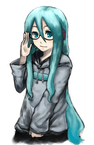 1girladjusting eyewearalternate hairstyleaqua eyesaqua hairbespectacledcasualfemale focusglasseshair downhoodhoodielong hairlooking at viewersolowaving