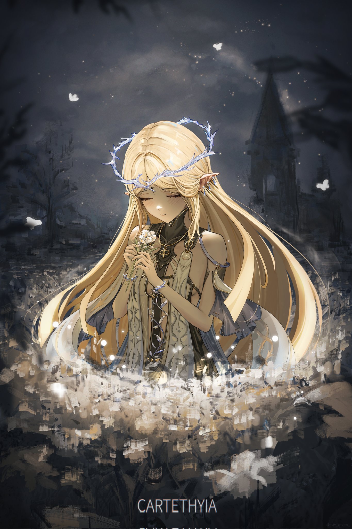 1girlbare shouldersblack collarblack dressblonde hairbreastscharacter nameclosed eyesclosed mouthcollarcrown of thornsdressearringsjewelrylong hairmultiple earringsnecklacepointy earssidelockssmall breastssolotabardtacet mark (wuthering waves)very long hairwhite tabard