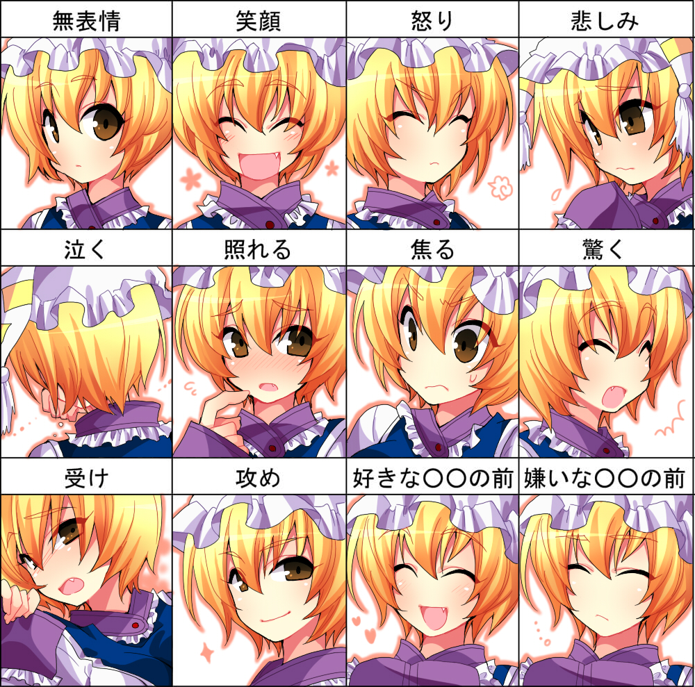 1boy1girlblonde hairblushbrown eyeschartclosed eyesfemale focushappyhatmultiple expressionsmultiple viewsshort hairsmile