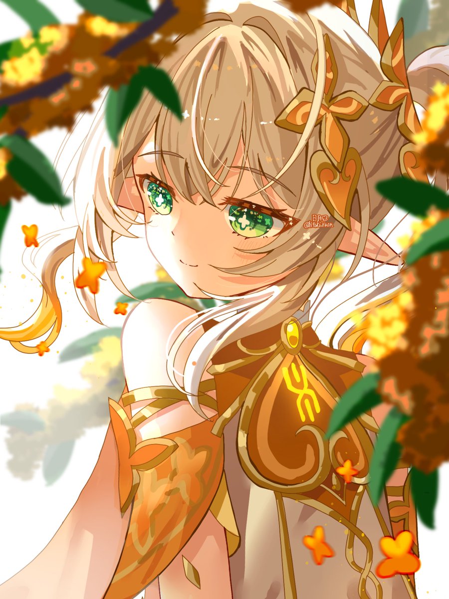 1girlalternate colorartist namebare shouldersblonde hairblushclosed mouthcross-shaped pupilsdetached sleevesdressgold trimgradient hairgreen eyeshair between eyeshair ornamentmulticolored hairpointy earssmilesolosymbol-shaped pupilsupper bodywhite dresswhite hairyellow sleeves