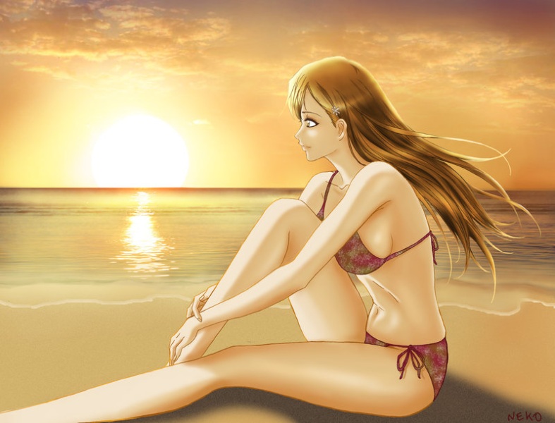 00s1girlbeachbikinibreastscloudhair ornamenthairpinlarge breastslong hairoceanorange hairside-tie bikini bottomsittingsunsetswimsuit