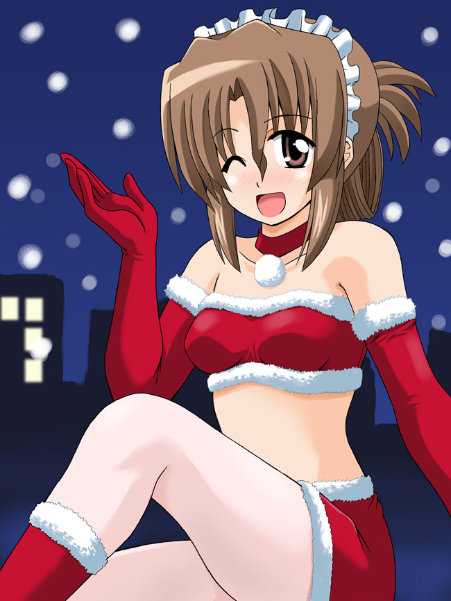 00s1girlbare shouldersblushbootsbreastsbrown eyesbrown hairchokerchristmaselbow glovesfemale focusfolded ponytailgloveshair uphairbandlong hairmidriffnavelone eye closedpantyhosered glovessanta costumesmilesolothighswhite pantyhosewink