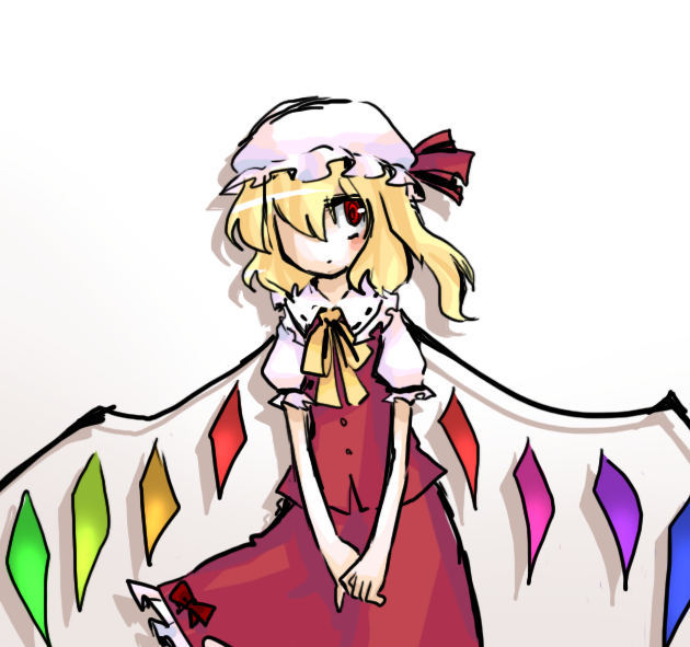 1girlblonde hairbuttonsfemale focusfrilled shirt collarfrilled skirtfrillshair over one eyehatmob capneck ribbonno noseown hands togetherred eyesred skirtred vestribbonshadowshort hairshort sleevesside ponytailsimple backgroundskirtsolovestwhite hatwingsyellow ribbon
