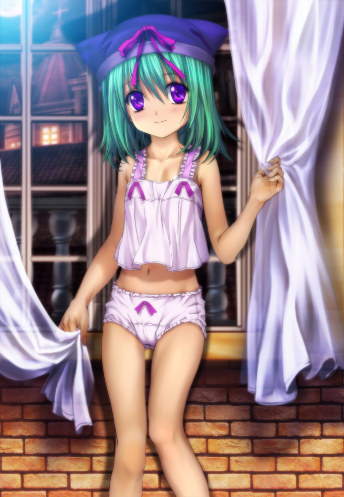 morishita yuuri, highres, photo (medium), 1girl, asian, bikini, bikini top only, black hair, breasts, brown bikini, brown eyes, chair, cleavage, collarbone, curtains, floral print, hair bun, japanese (nationality), large breasts, looking at viewer, print bikini, single hair bun, swimsuit, underboob, upper body, window