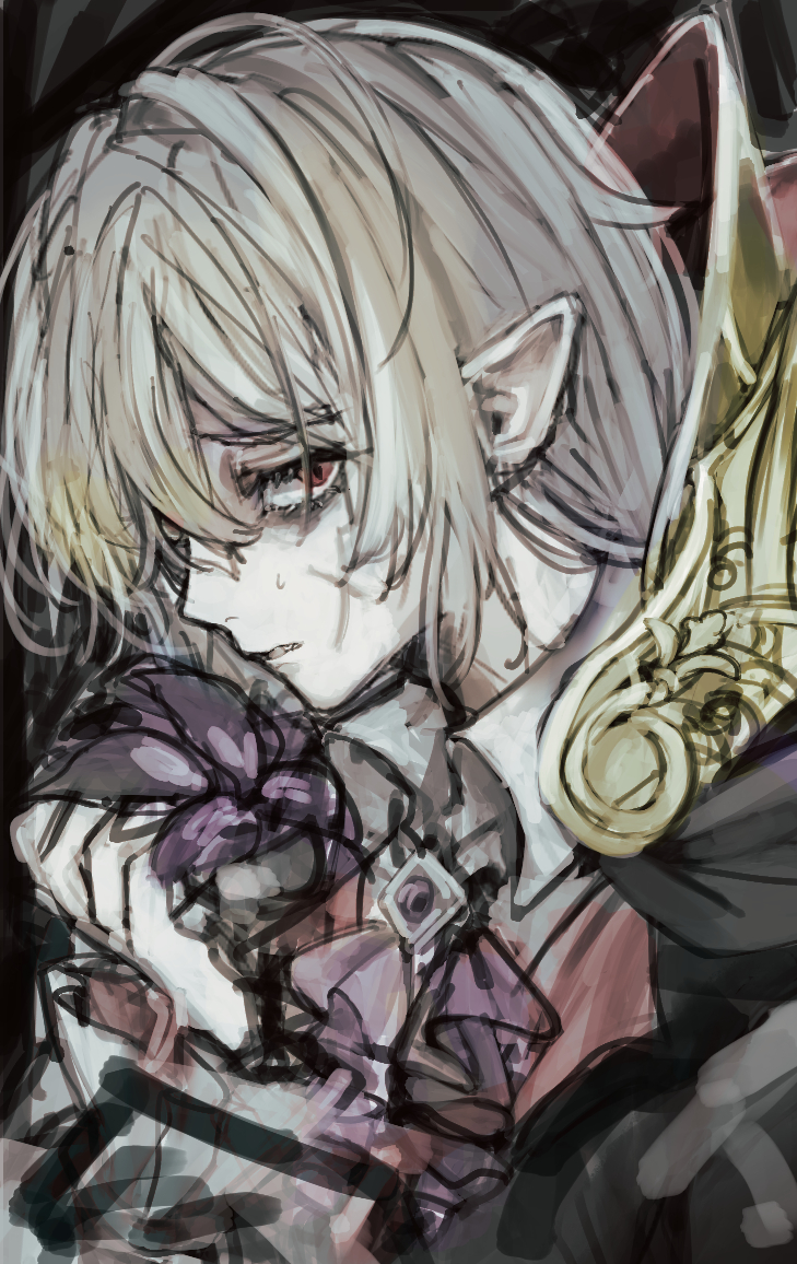 1boyalbinoalternate costumeascotblonde hairflowerlooking backmale focuspale skinpointy earsprofilepurple ascotraised inner eyebrowsred eyesscarscar on facesweatwhite hairyominaito
