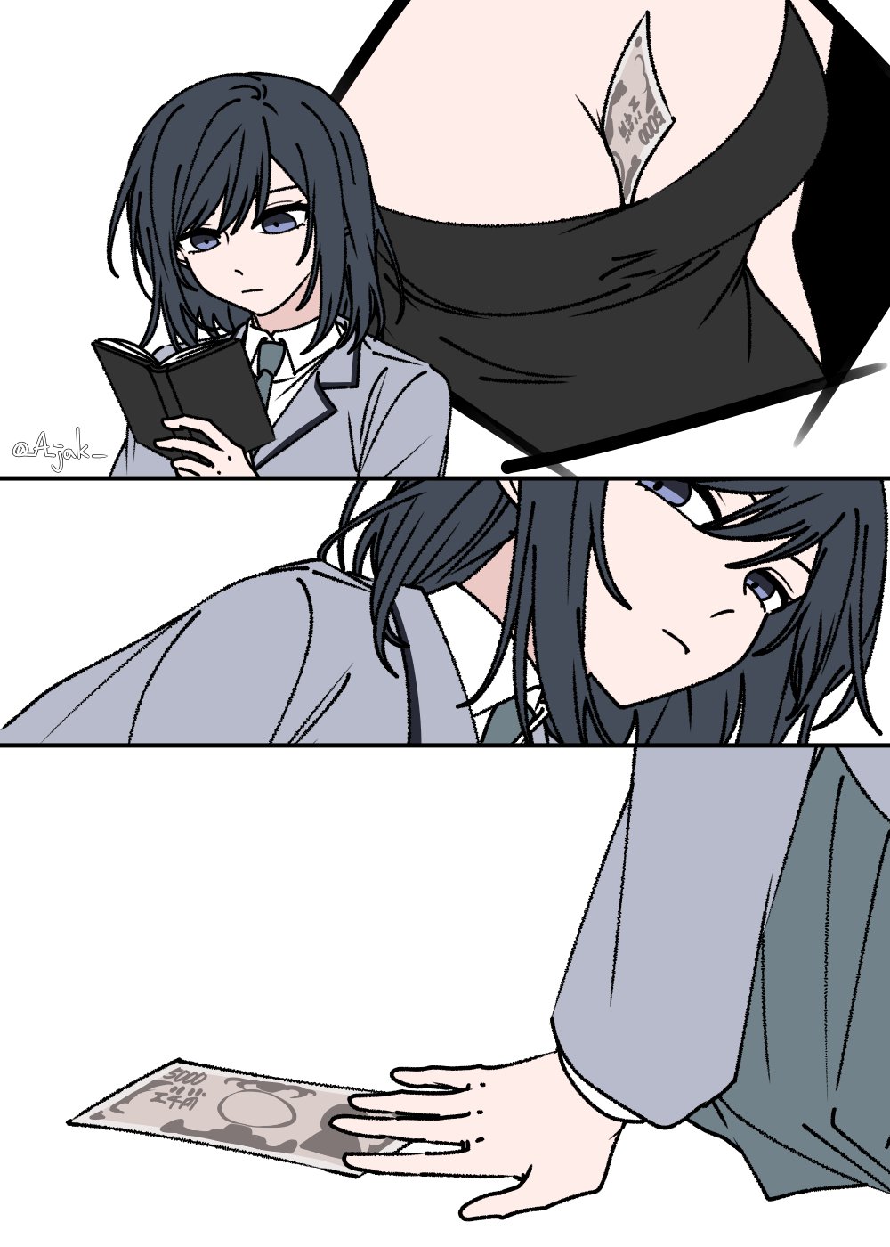 2girlsbanknoteblack hairblue eyesbookbreastscleavagegrey jacketgrey necktiehair between eyesholdingholding bookjacketlong sleevesmedium hairmoneymultiple girlsnecktiereadingtucked money