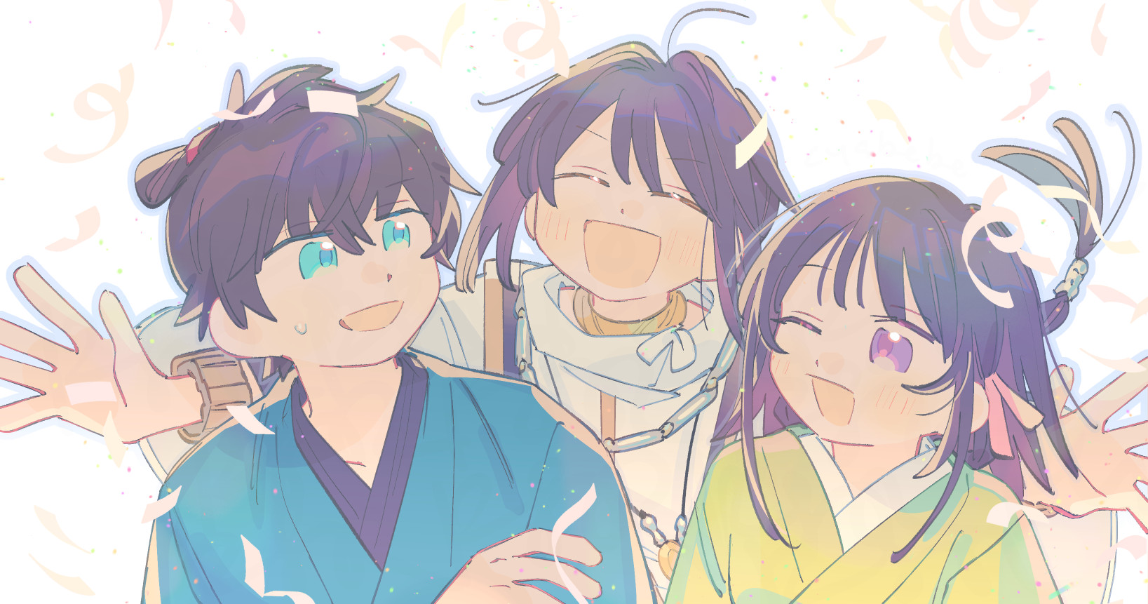 cherlinq, cyrene (honkai: star rail), cyrene (ripples of past reverie) (honkai: star rail), honkai: star rail, honkai (series), commentary, 2girls, bare shoulders, blue eyes, breasts, coat, cyrene (aedes elysiae) (honkai: star rail), dress, dual persona, flower, hair flower, hair ornament, hand on another's shoulder, jewelry, looking at viewer, multicolored hair, multiple girls, necklace, pink hair, purple coat, purple eyes, short hair, simple background, small breasts, smile, two-tone hair, white background, white dress, white hair
