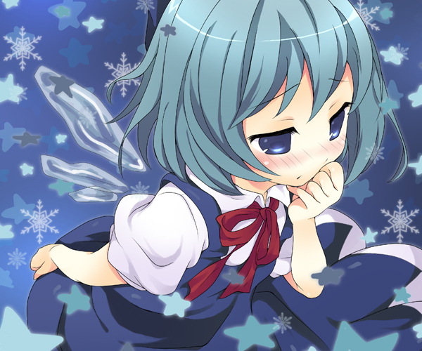 1girlblouseblue eyesblue hairblushcollared shirtfemale focushand on own chinmatching hair/eyesshirtshort hairsimple backgroundsnowflakessolostar (symbol)white shirtwings