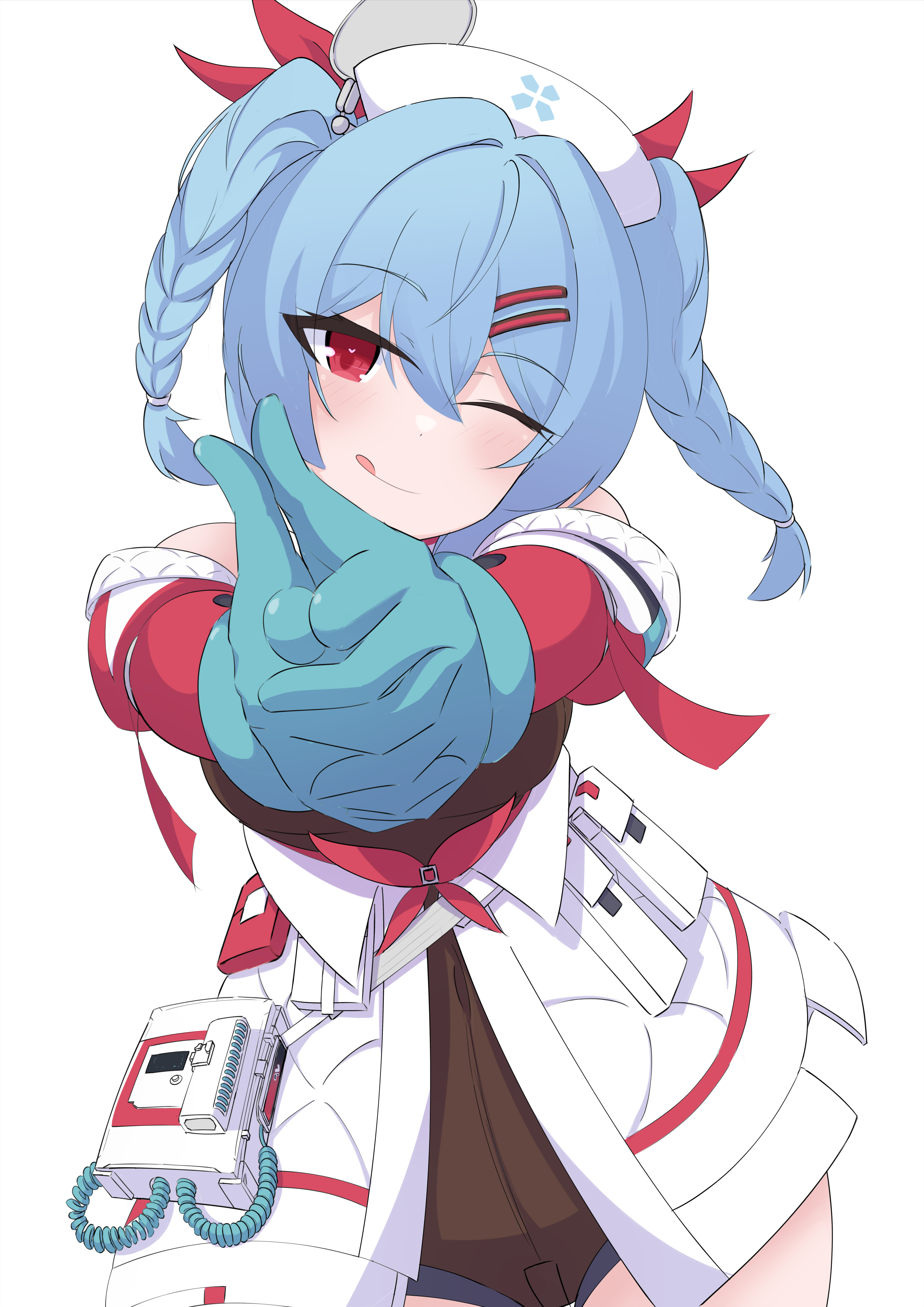 :q1boy1girlaimingaiming at viewerbare shouldersblue glovesblue hairblushbraiddouble finger gunfinger gungloveshair between eyeshair ornamenthair ribbonhaircliphands uphatjacketlong sleevesmedium hairnurse capone eye closedred eyesred ribbonribbonsmilesolotonguetongue outtwin braidstwintailswhite jacket