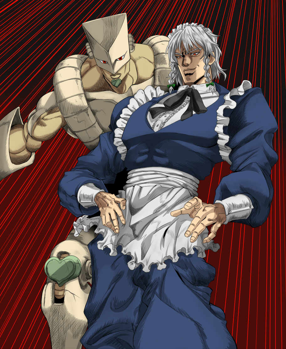 2boysapronaraki hirohiko (style)comic panel redrawcosplaycrossdressingcrossdressing (mtf)izayoi sakuya (cosplay)jojo posemaidmaid apronmale focusmale maidmanlificationmanlymultiple boysmuscularparodypower connectionstand (jojo)style parody