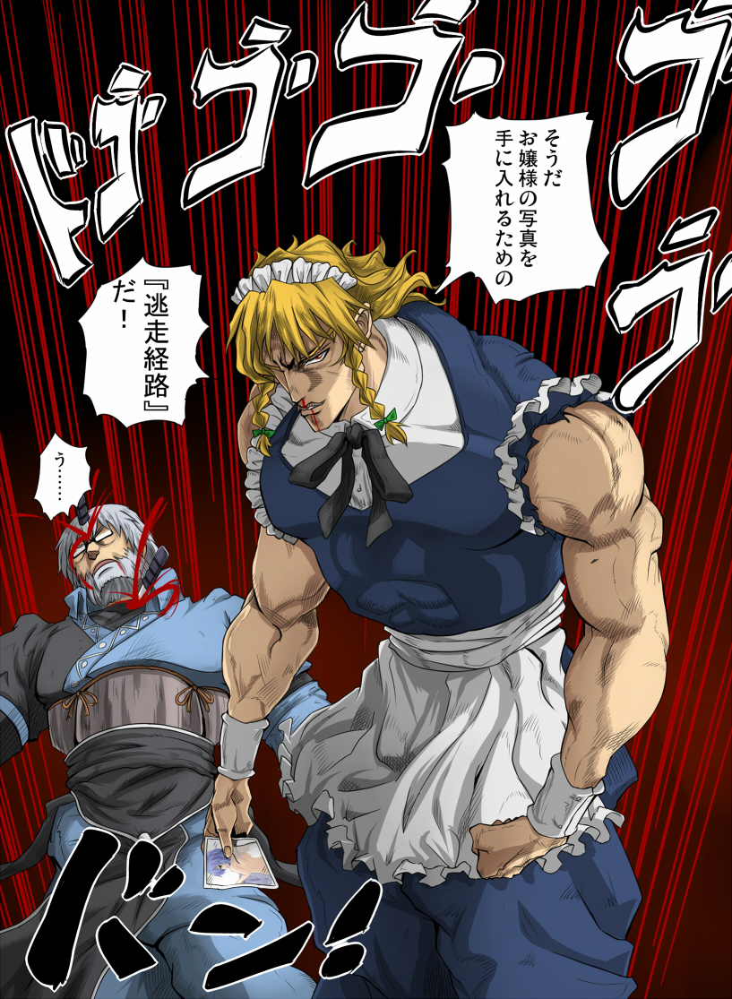 2boysalternate hair coloraraki hirohiko (style)bloodcomic panel redrawcrossdressingcrossdressing (mtf)knifemaidmale focusmale maidmanlificationmultiple boysmuscularnosebleednudeparodyphoto (object)power connectionstyle parodythrowing knifeweapon
