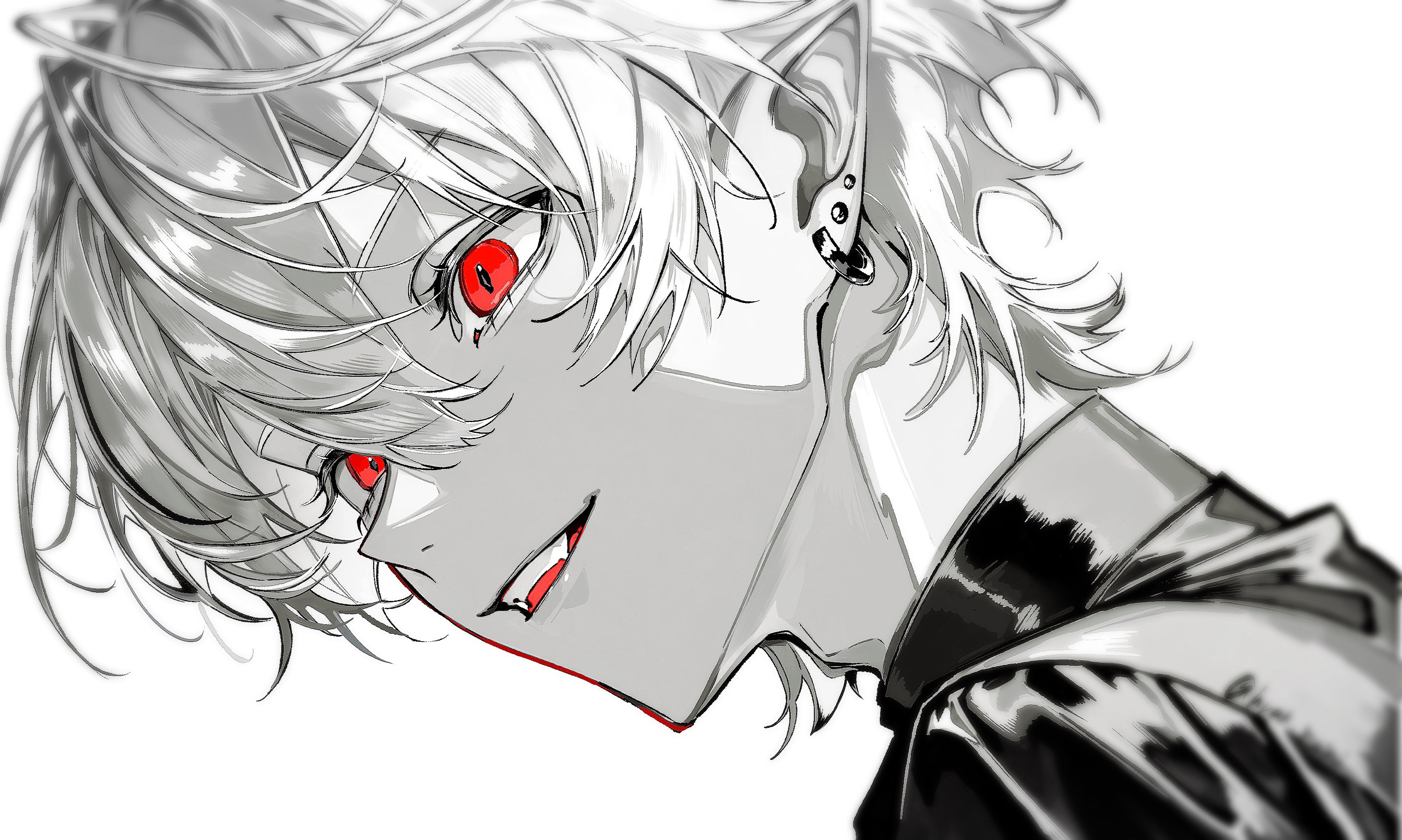 1boyadam's appleearringseyelashesfangshair behind earhair between eyesjewelrymale focusmultiple earringsopen mouthpiercingpointy earsred eyesshirtsimple backgroundslit pupilssmilesolospot colorteethupper teeth onlywhite background