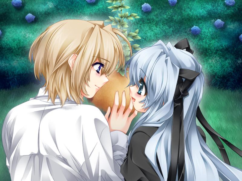 sasarai, sasarai (suikoden), viki, viki (suikoden), gensou suikoden, gensou suikoden iii, lowres, 1boy, 1girl, borrowed clothes, couple, gloves, hetero, mosaic background, putting on gloves