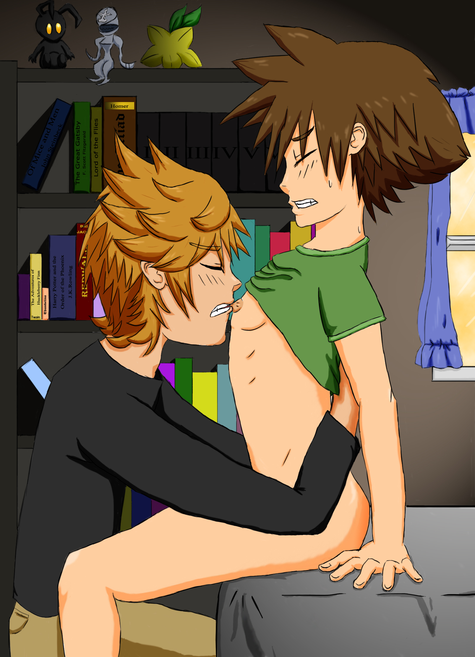 mishythesheep, dazzi, palworld, absurdres, highres, 1boy, 1girl, black pants, breasts, bulge, cloud, colored skin, grin, hair over eyes, horns, large breasts, long hair, looking at viewer, looking back, pal (creature), pants, ponytail, purple horns, purple skin, purple tube top, red shirt, shirt, single horn, smile, strapless, tube top, white hair