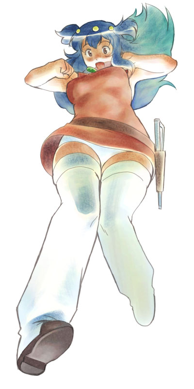 eddybird55555, tenkyuu chimata, yamashiro takane, touhou, unconnected marketeers, commentary, english commentary, highres, 2girls, animal ears, arms up, backpack, bag, blue background, blue eyes, blue hair, blush stickers, breasts, camouflage, camouflage hat, camouflage headwear, camouflage shirt, camouflage skirt, cape, cat ears, cat girl, cloak, collar, dress, eyes in shadow, flat cap, frilled collar, frilled skirt, frills, furrowed brow, green eyes, green hair, green hat, green shirt, hairband, hat, jewelry, key, key necklace, long sleeves, looking at another, looking down, looking up, medium breasts, medium hair, multicolored dress, multicolored hairband, multiple girls, necklace, no pupils, on person, open mouth, orange sleeves, patchwork clothes, pocket, purple eyes, purple hair, rainbow gradient, rainbow hairband, shirt, short hair, skirt, sleeves rolled up, sweat, v-shaped eyebrows, white cape, white cloak